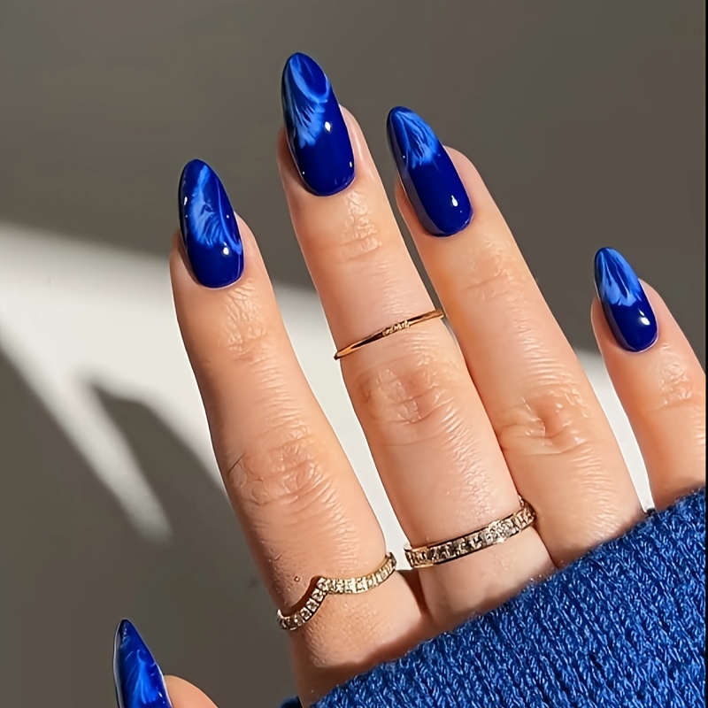 TEMU 24개 중간 크기 아몬드 모양 파란색 인조 손톱 - 튼튼한 여성용 인조 네일, 스타일리시한 아크릴 풀 커버 네일 팁, 살롱 퀄리티 매니큐어, 손상 없음 및 간편한 부착, 재사용 가능