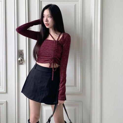 [옷자락] 여성 슬림핏 줄지 스트랩 셔링 크롭 긴팔 니트