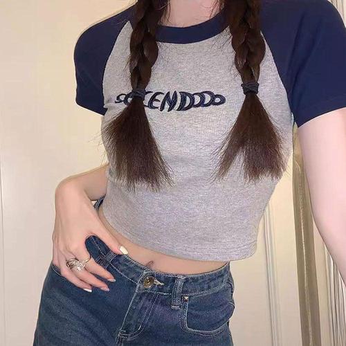 [에이치플러스몰]반팔티셔츠 배색 크롭티셔츠 여성캐주얼티 하이틴