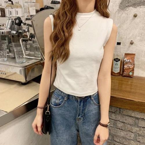 여성용 조끼 탱크 탑 솔리드 컬러 니트 티셔츠 크롭 캐미솔 스웨터 하프 터틀넥 봄 가을 민소매 топ женский