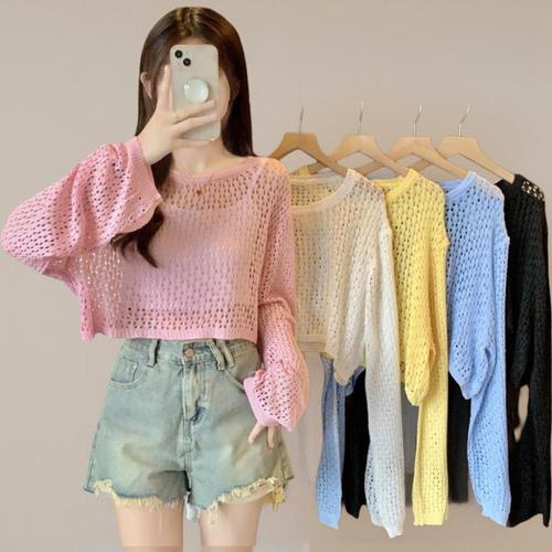 |CCT9FE9|여성 루즈핏 크롭 펀칭 긴팔 비치 니트 커버업