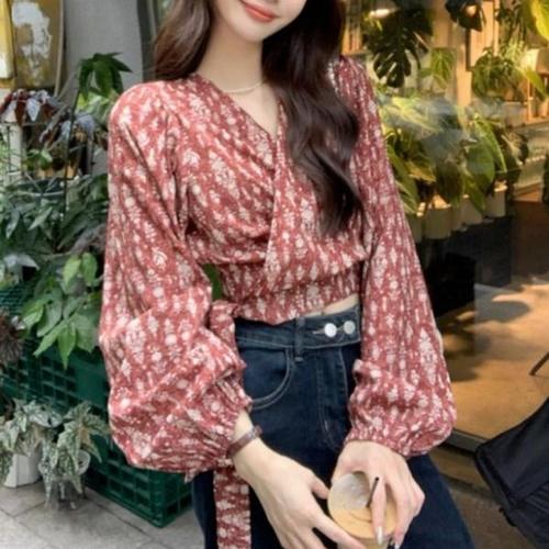 [옷자락]여성 가을 리본넥 셔링 퍼프 긴팔 크롭 블라우스