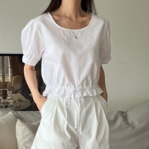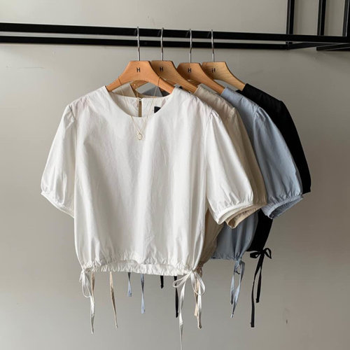 에이치다 / (재진행)퓨어 크롭 퍼프 소매 스트링 블라우스 4color