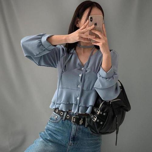 [신상오픈런]여성 브이넥 레이어드 프릴 크롭 퍼프 간절기 셔츠