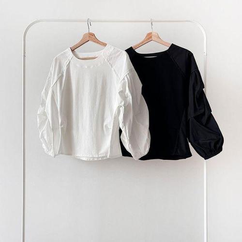 [옷자락] 여성 나그랑 셔링 퍼프 블라우스 크롭 오버핏