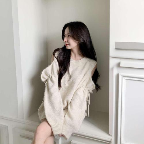 [시크블랙]크리그 루즈핏 어깨 트임 리본 앙고라 울 니트