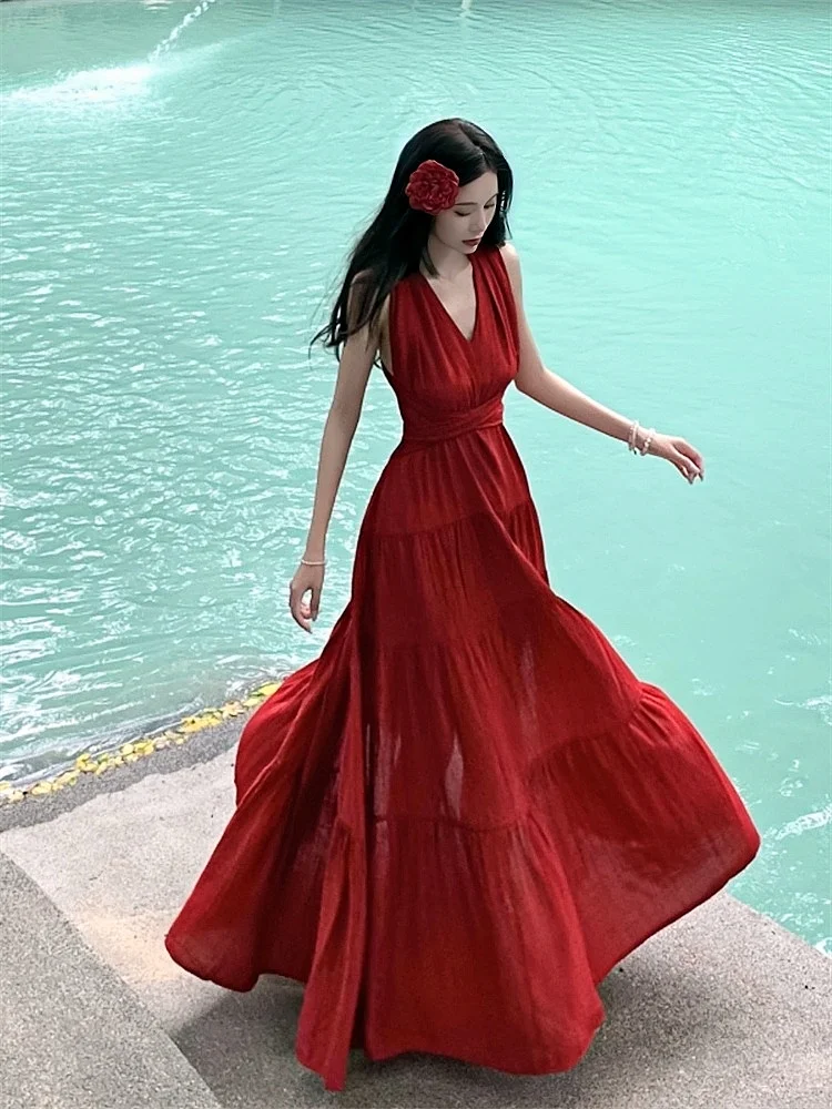 백리스 솔리드 컬러 플로위 롱 드레스 여성 우아한 휴가룩 레드 플로리아 오렌지 파티 프롬 비치 드레스 티어드 러플 가운
