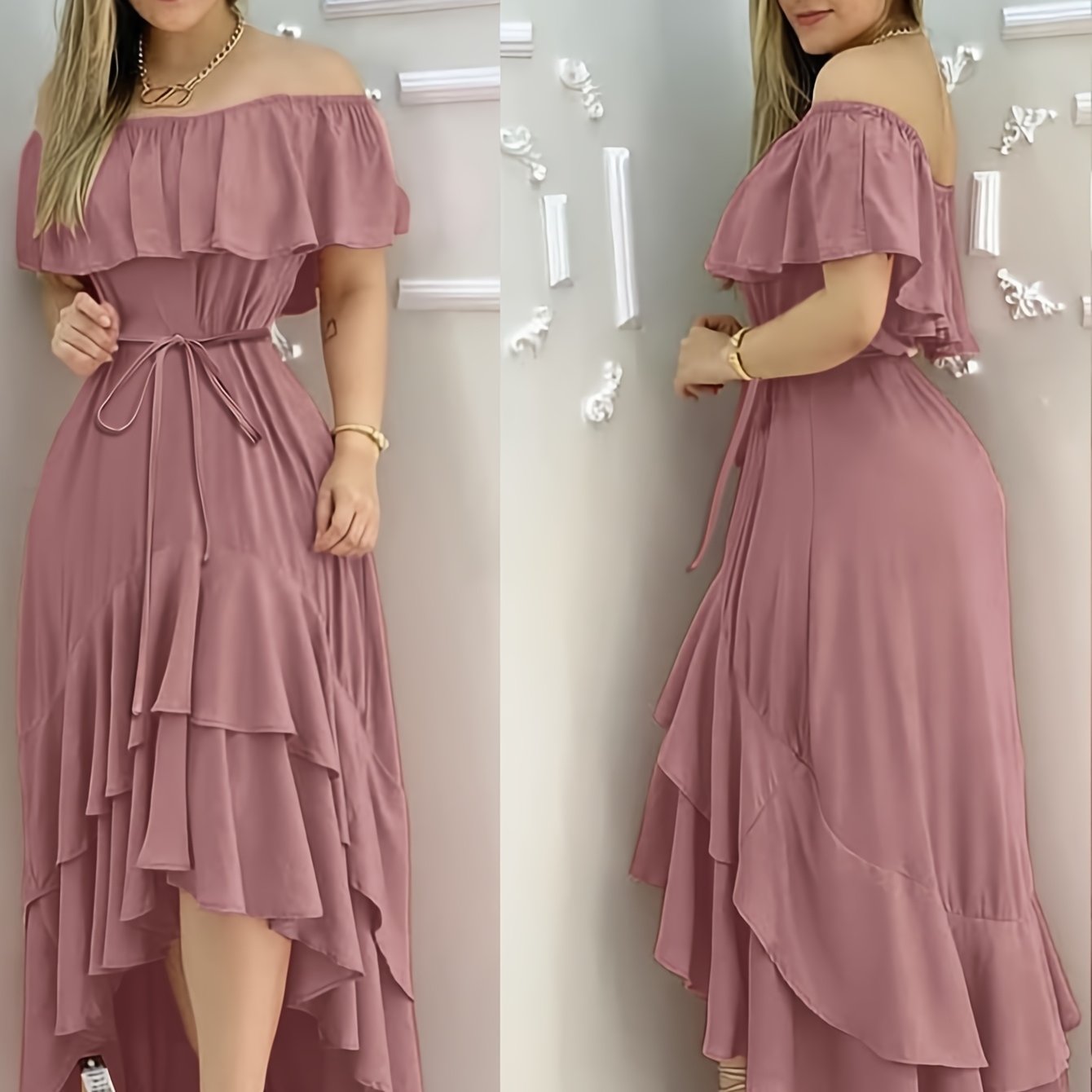 TEMU 여성용 새로운 여름 오프숄더 러플 헴 맥시 드레스, 신축성 없는 소재, 데일리룩으로 우아하고 다재다능함