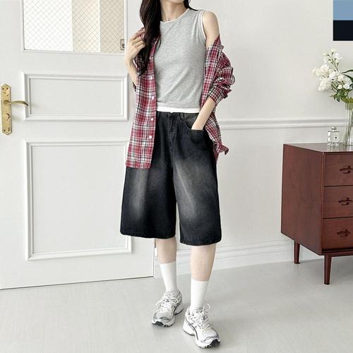 여성 힙한 빅사이즈 앞핀턱 와이드 뒷밴딩 버뮤다 데님 반바지 WFJ0J6P