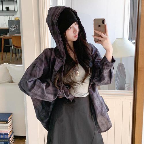[옷자락]여성 루즈핏 클래식 체크 후드 블라우스 데일리 면 셔츠