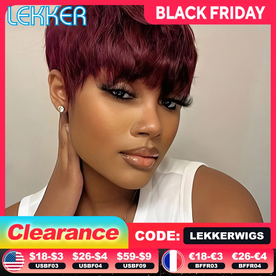 레커 컬러드 숏 픽시컷 스트레이트 밥 100% 인모 가발 앞머리 포함 여성용 브라질 레미 헤어 버건디 레드 클리어런스
