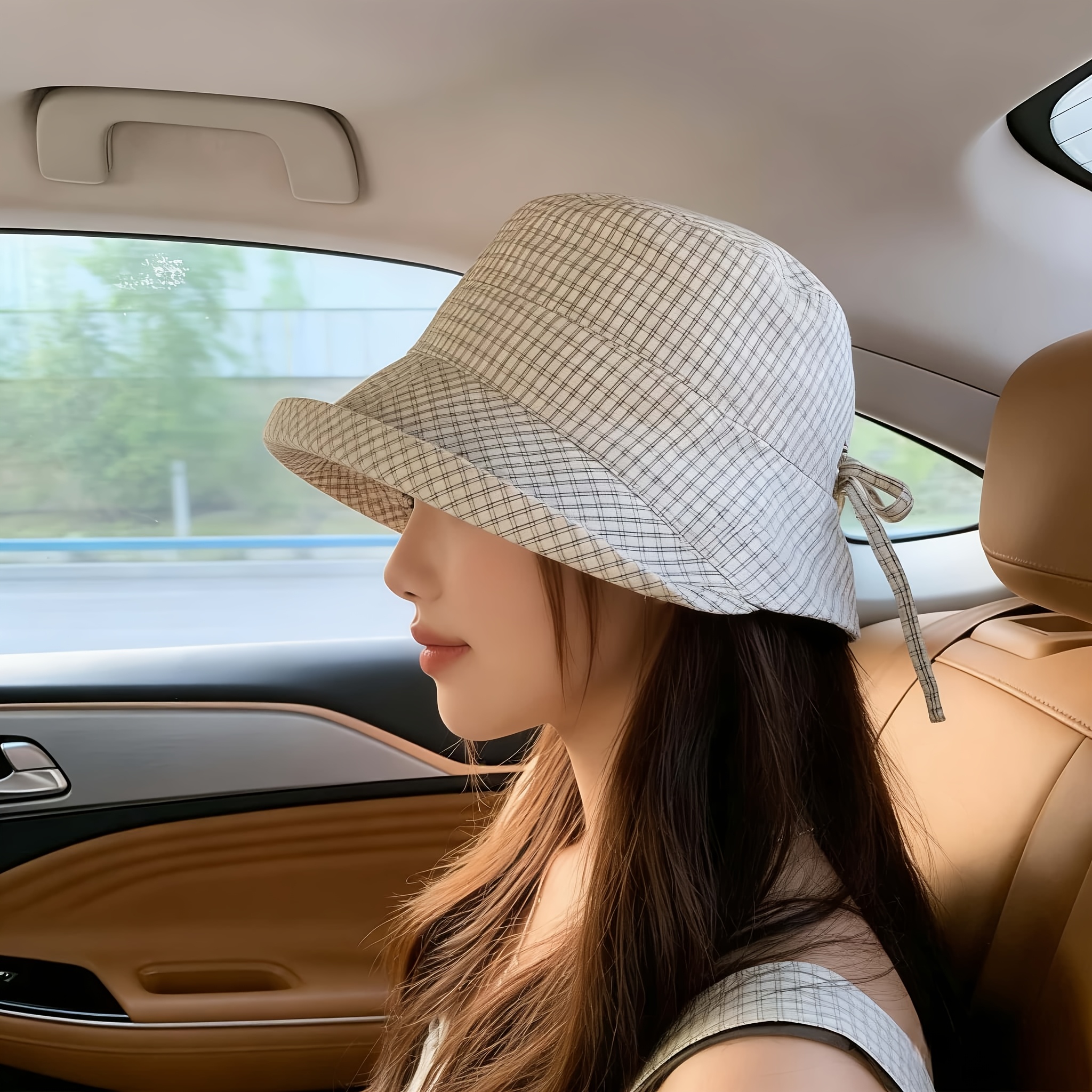 TEMU 가벼운 러플 귀여운 스타일 햇빛 가리개 여름 모자 2025년 신상 체크무늬 햇빛 가리개 휴대용 여행용 다용도 버킷햇