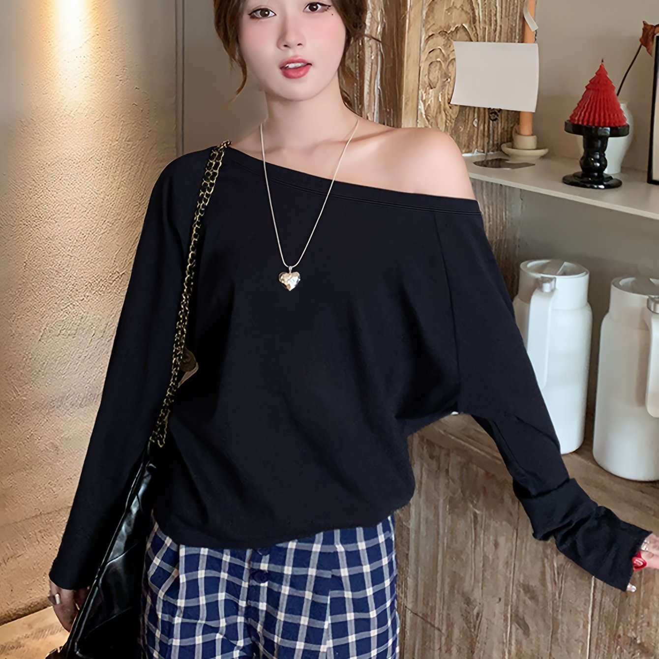 TEMU 여성용 오버사이즈 숄더리스/원쇼울드러운소매 튜닉탑 - 고신축력 솔리드블랙 캐주얼 이너셔츠, 비대칭넥라인 레이어링룩, 가을 겨울 데일리 & 포멀룩에 적합한 편안핏 둥근네크라인과 노출된 숄더디자인, 손세탁이 가능한 부드러운 소재로 쾌적하게 착용, 탄력 있는 패브릭으로 트렌디한 스타일