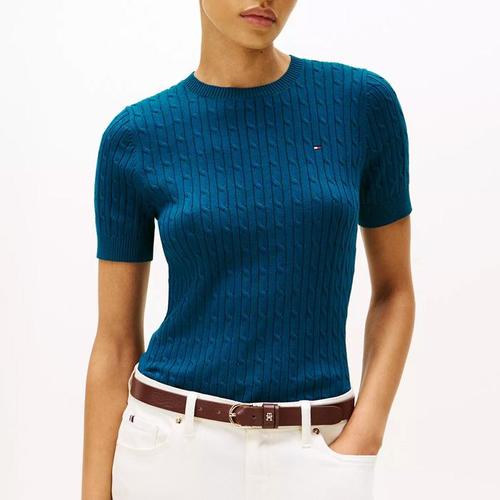 [해외배송] 타미 여자 케이블 반팔 스웨터 Turquoise