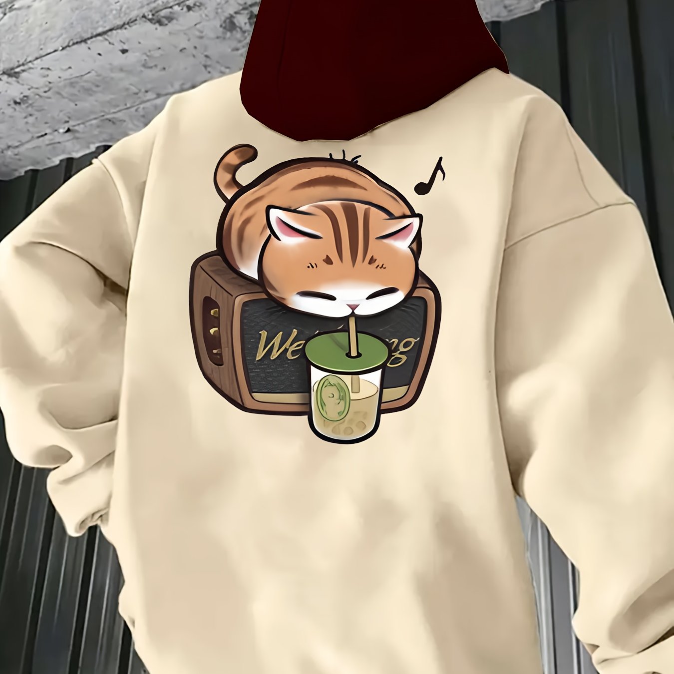 TEMU 남성용 그린 캣 & 보바티 그래픽 후드 스웨트셔츠 - 일본 우키요에 백 프린트, 캥거루 포켓, 올시즌 캐주얼 스트리트웨어 풀오버, 드로스트링 후드, 기계 세탁 가능 레귤러 핏 패션 탑