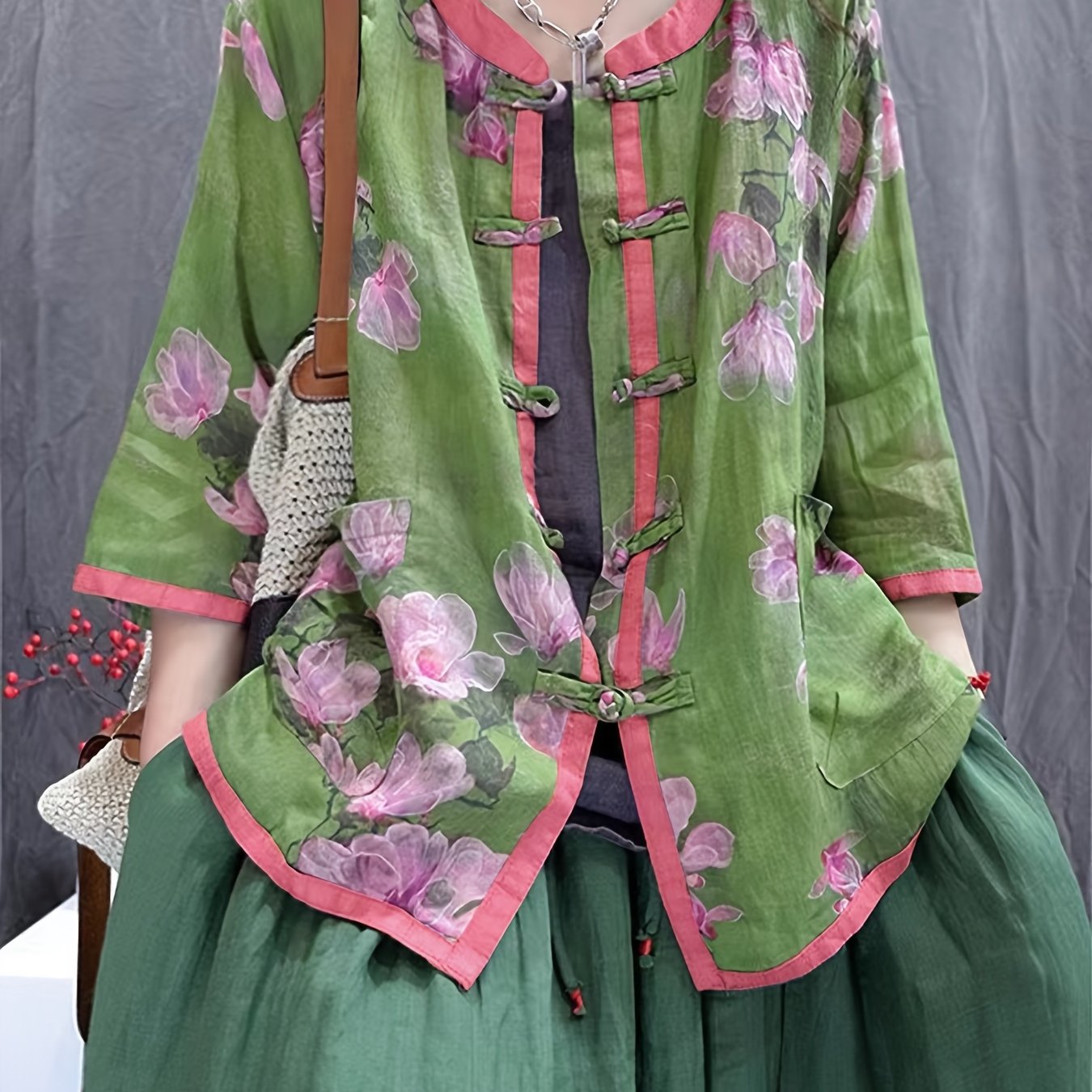TEMU 새로운 빈티지 프린트 버튼 가디건, 예술적이고 캐주얼한 스타일, 루즈핏의 7부 소매, 우아한 바캉스 스타일을 위한 원단