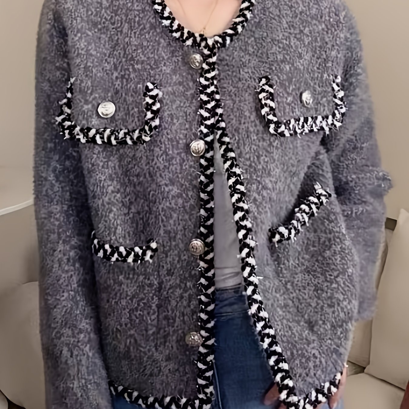 TEMU 여성용 그레이 루즈핏 긴팔 가디건 - 라운드 넥, 프랑스 브레이드 엣지, 대비 칼라, 버튼 프론트, 캐주얼 및 정장 착용을 위한 다목적 재킷, 다용도 패션, 프랑스 브레이드 스웨터