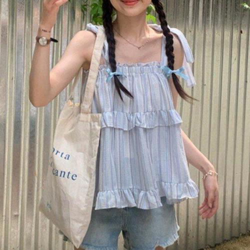 2025 여름 신상 한국풍 자수 V넥 민소매 니트 탱크탑 여성 패션 스트라이프 버튼 티셔츠 탑