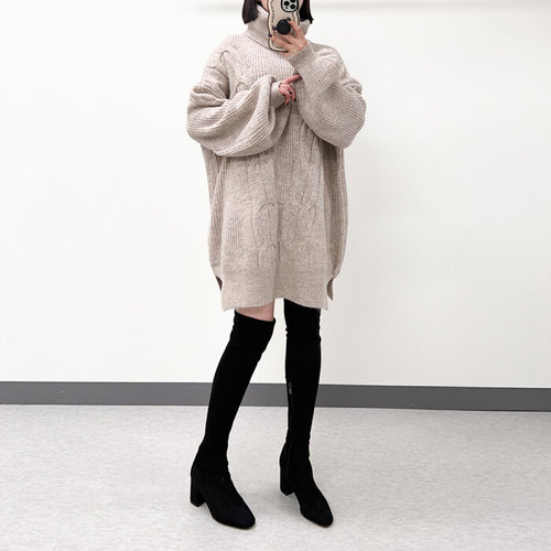 미즈큐즈 / 빅 터틀넥 목폴라 꽈배기 오버핏 미니 니트 원피스 빅