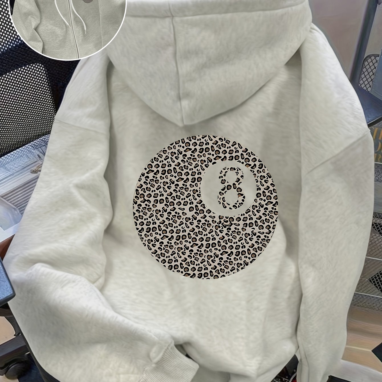 TEMU 여성용 라이트그레이 후드집업 - 표범무늬 & 8번 숫자 프린팅, 두꺼운 지퍼풀오버 | 캐주얼/스트리트웨어 / 사계절 세탁가능한 후디재킷 (끈조임형 후드 + 이완핏) / / 도시패션/ 내구성 있는 소재/ 포근한 후드티