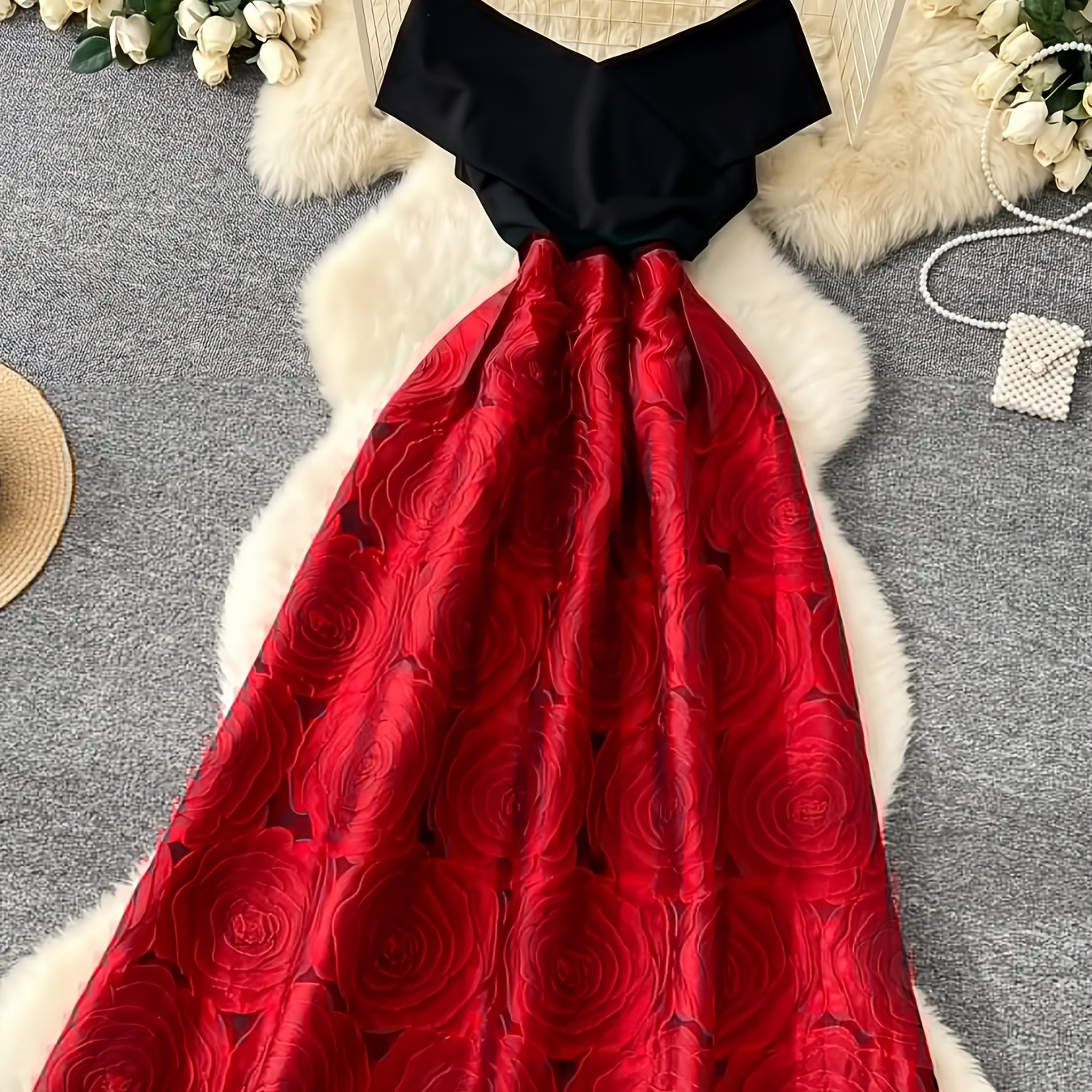 TEMU 여성용 빈티지 오프숄더 A라인 드레스 - & 블랙 컬러블록 파티, 공식 행사, 일상복 - 매력적인 핏 & 우아한 레트로 스타일 사계절용, 세련된 디자인, 고품질 스티칭, 패션 애호가