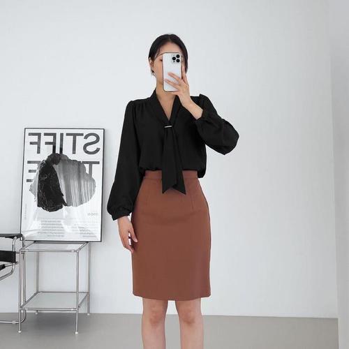[옷자락] 여자 하객룩 골드타이 퍼프긴팔 브이넥 튜닉 블라우스