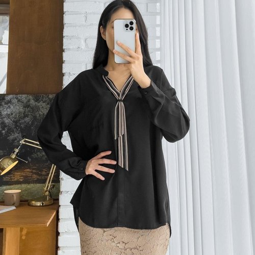 [옷자락] 여자 배색타이 페미닌 브이넥 튜닉 오버핏 블라우스