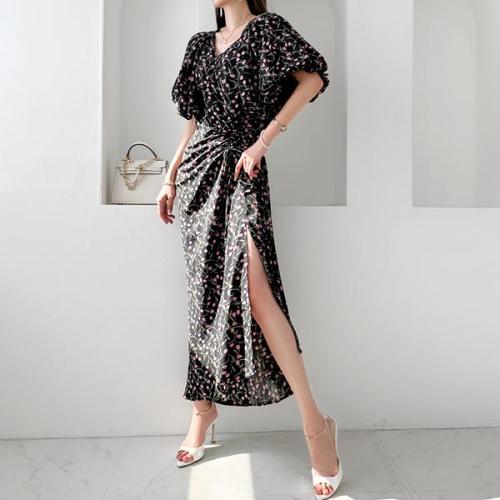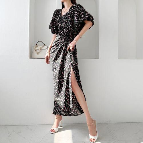 슈팅스타 / V넥 퍼프소매 슬리브 튤립패턴 원피스 209658