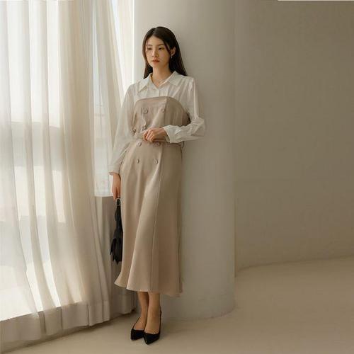 [스타일온미][스타일온미] 제디크 금장 버튼 더블 트렌치 디자인 배색 카라 A라인 롱 플레어 원피스