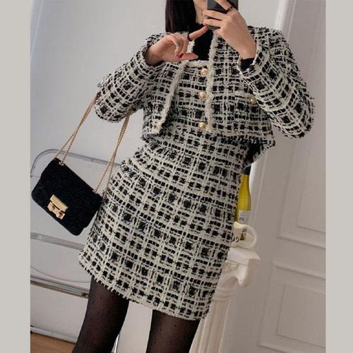 트위드 세트 봄가을 트위드 자켓+스커트 투피스 여성 하프코트2308F11Y06