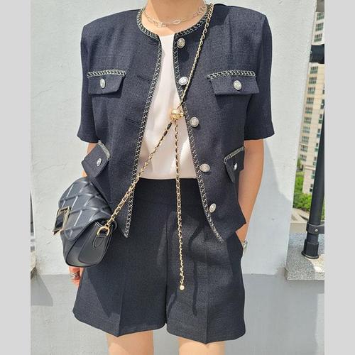 [바이어스]노카라 트위드 자켓 뒷밴딩 반바지 팬츠 세트 투피스 (15149647A)