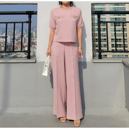 [바이어스]트위드 라운드넥 와이드 통 슬랙스 바지 세트 투피스 (14159764A)
