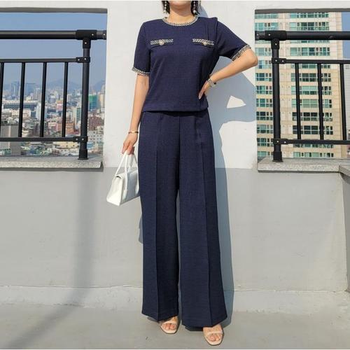 [바이어스]반팔 트위드 룩 와이드 통 슬랙스 바지 세트 투피스 (14158609A)