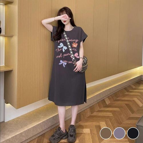 여성 예쁜 리본 영문 넉넉한 오버핏 밑단 트임 원피스 WFIZLG1
