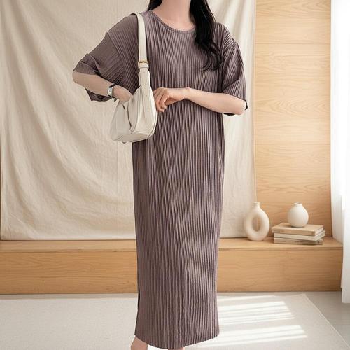 [옷자락] 여성 플리츠 반팔 라운드 롱 원피스 밑트임 디자인