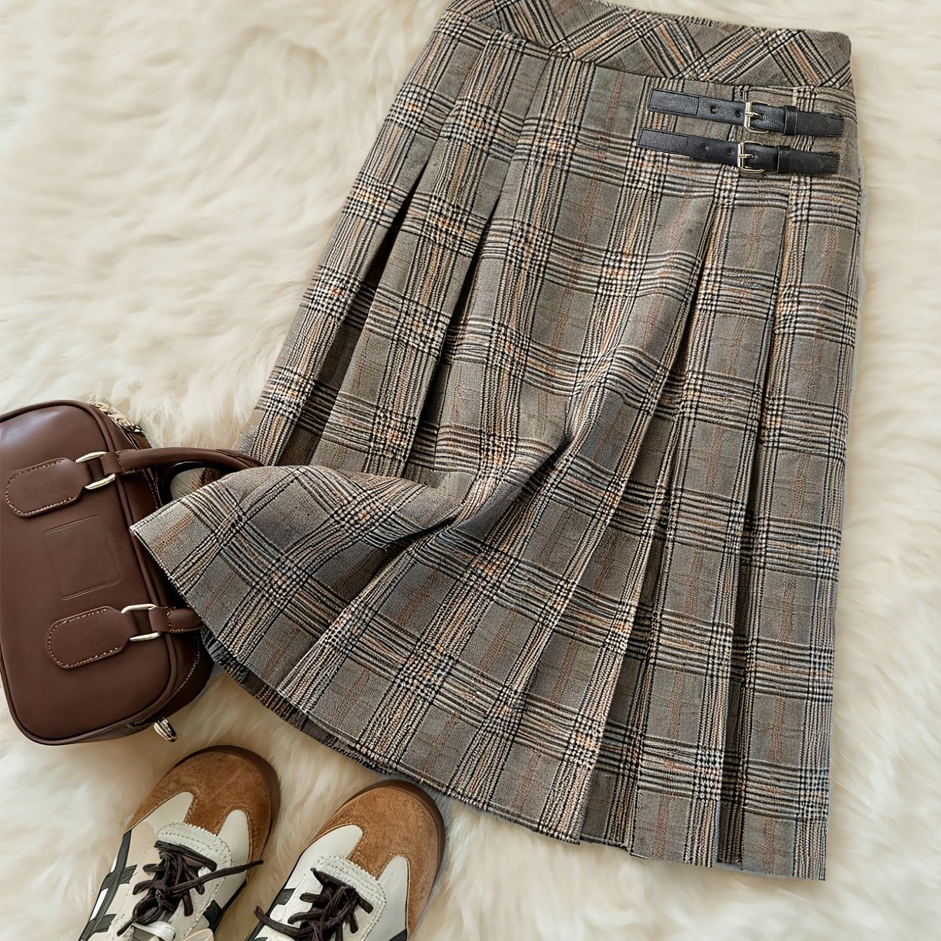 TEMU 여성용 브리티시 빈티지 아카데믹 플리츠 체크 스커트 - 미드 길이 숏 스커트, 더블 버튼 클로저, 체크 패턴으로 오피스, 출퇴근, 여행, 애프터눈 티에 적합 - 가을/겨울용 세탁기 세탁 가능 스커트