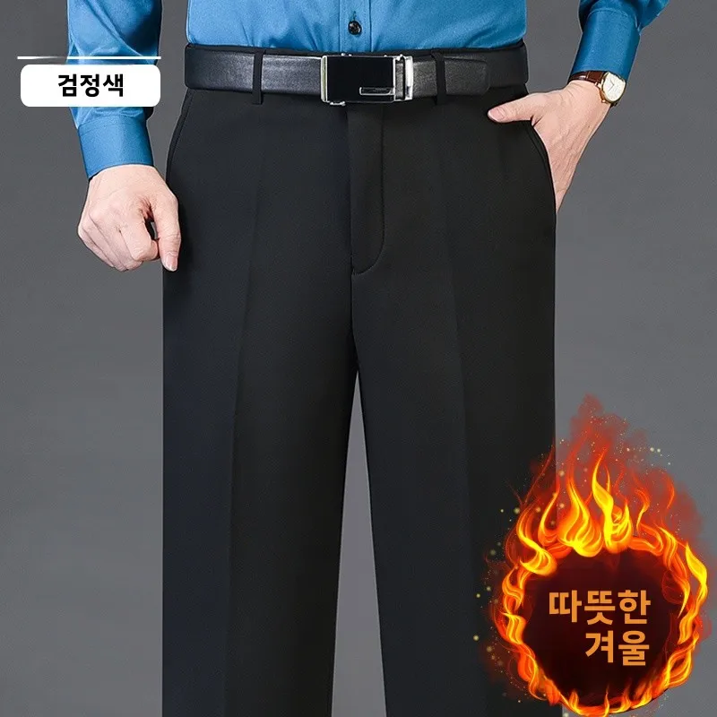 두꺼운 플리스 안감 겨울용 남성 캐주얼 바지 하이웨이스트 루즈 스트레이트 레그 비즈니스 캐주얼 바지 중년용