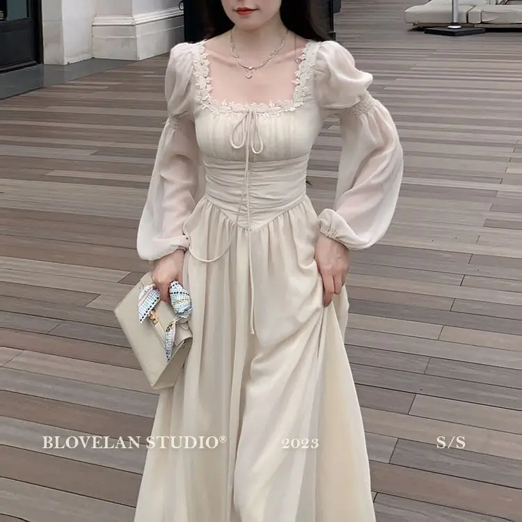 로리타 달콤한 섹시한 쉬폰 드레스 여성 패션 슬림 우아한 프랑스 드레스 통기성 긴 소매 비치 휴가 파티 드레스