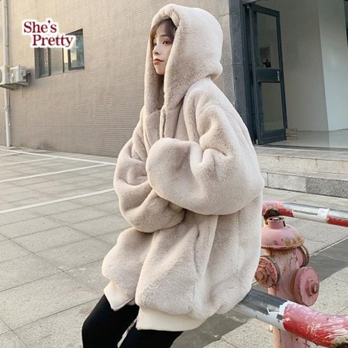 여성 캐주얼 인조퍼 데일리 루즈핏 인조 사이즈 예쁜상의 모피 오버 패션 후드 코트 공항