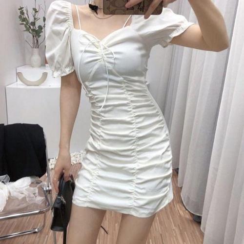 이쁘다요 주름 원피스 룩 오프 데이트 미니 퍼프 숄더 셔링 여름 WFLMEUY