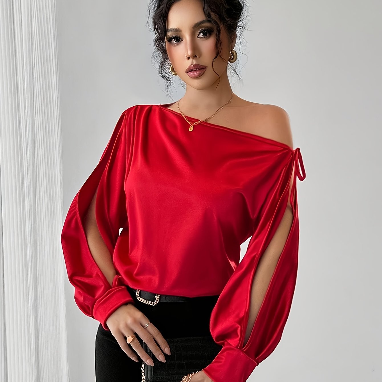 TEMU 여성용 섹시 오프숄더 긴팔 블라우스 - 세련된 원숄더 탑, 세탁기 사용 가능 파티 & 일상복, 가을/봄 시즌 우아한 여성 의류, 캐주얼 셔츠, 트렌디한 상의, 내구성 좋은 소재, 스타일리시 셔츠, 여성용 가을 워드로브, 고급 , 패션 애호가용