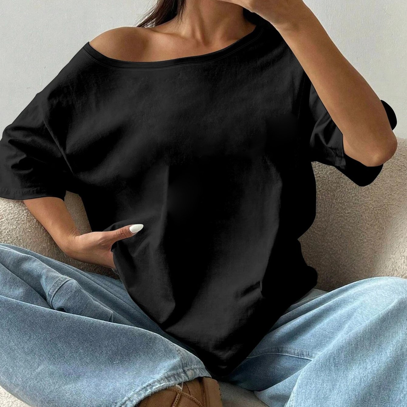 TEMU 여성용 Y2K 오프숄더 티셔츠 - 신축성 파티 & 일상용 탑, 고탄력 캐주얼 셔츠 - 비침 없는 솔리드 블랙 여성 블라우스, 여름 패션 상의, 시원한 여름 착용감