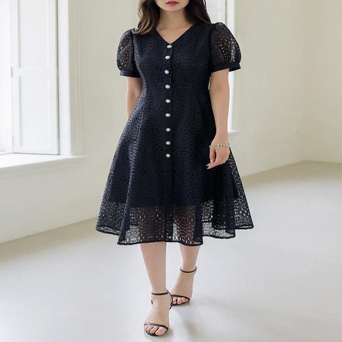 [스타일온미][루이스엔젤] 에디안 진주 버튼 모티브 펀칭 레이스 A라인 플레어 원피스