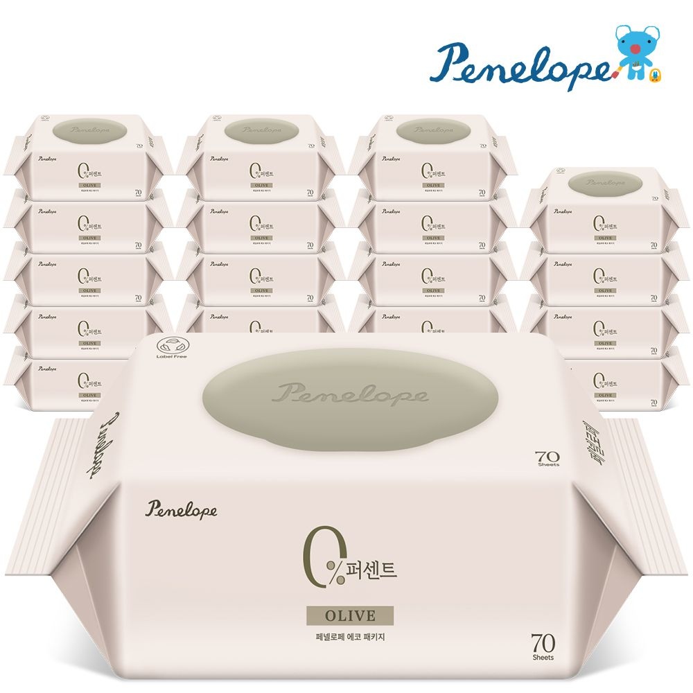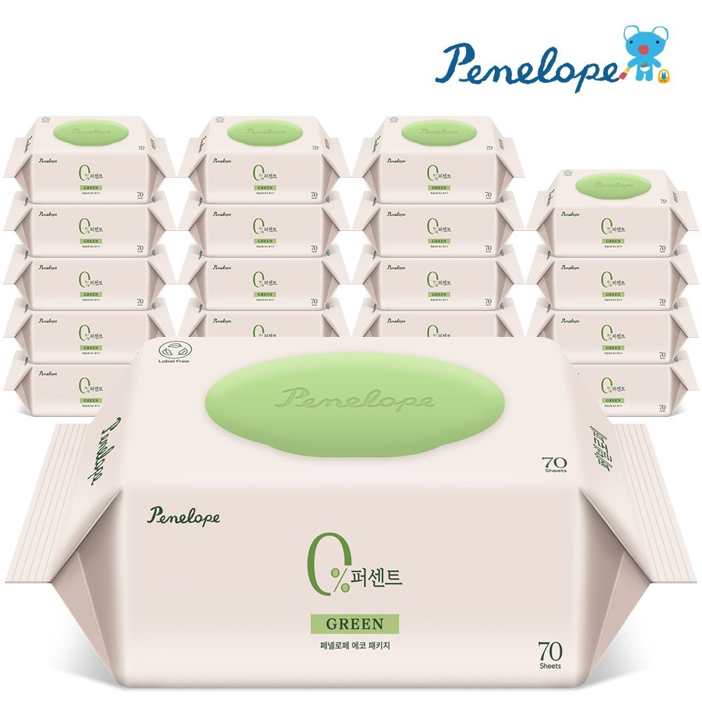 [페넬로페]물티슈 70평량 20팩 페넬로페 0퍼센트 그린 캡형 고평량 아기물티슈