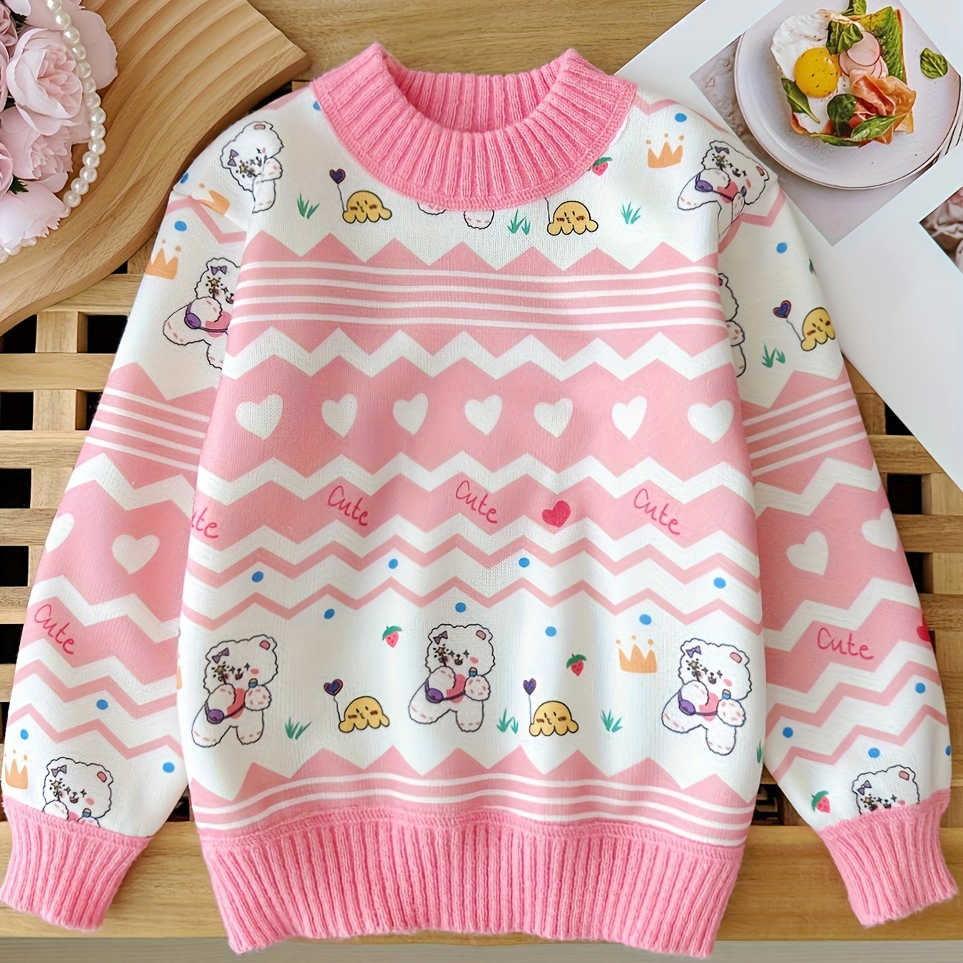 TEMU 2025 가을 겨울 소녀용 니트 풀오버 스웨터, 귀여운 캐릭터 크로스보더 탑 (유아 및 중아용)