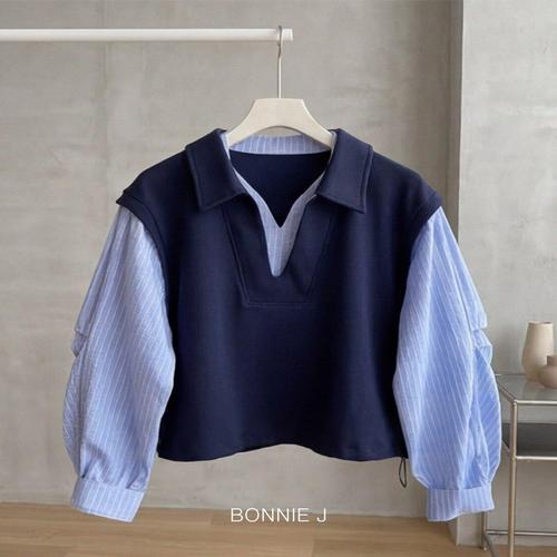 [보니제이]페이크 레이어드 스트라이프 셔츠 티셔츠 브이넥 조끼
