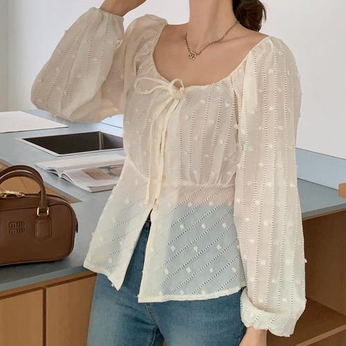 옷자락 / 여자 시스루 벌룬 스카시 방울 리본 페플럼 블라우스