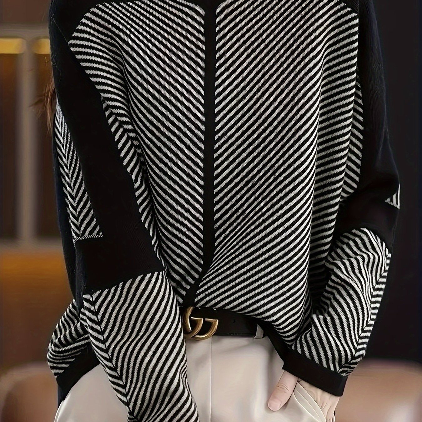 TEMU 플러스 사이즈 - 플러스 사이즈 - Didi Direction의 아메리칸 레트로 니치 패치워크 스웨터. V넥, 루즈핏 디자인, 컬러 블록 스트라이프가 특징입니다. 이 빈티지 캐주얼 풀오버는 따로 입거나 레이어드하게 입을 수 있습니다.