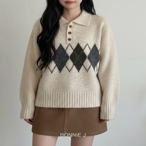 [보니제이]클래식무드 아가일 패턴 폴로 카라 버튼 니트 3color