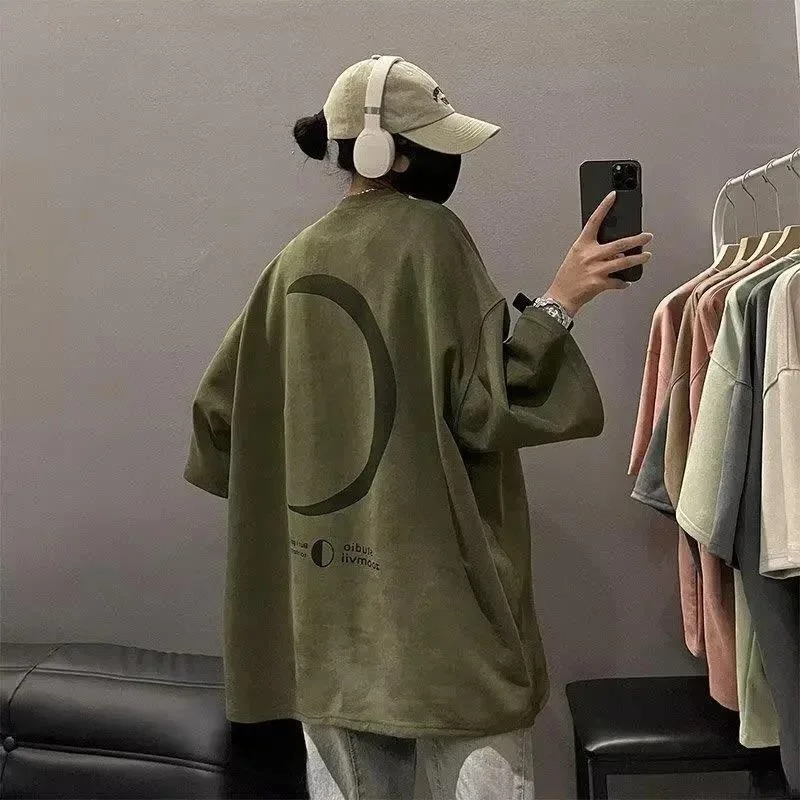 아메리칸 레트로 스웨이드 반팔 남성 티셔츠 트렌디 오버사이즈 밀리터리 그린 5부 소매 여름 루즈핏 라운드넥 티셔츠